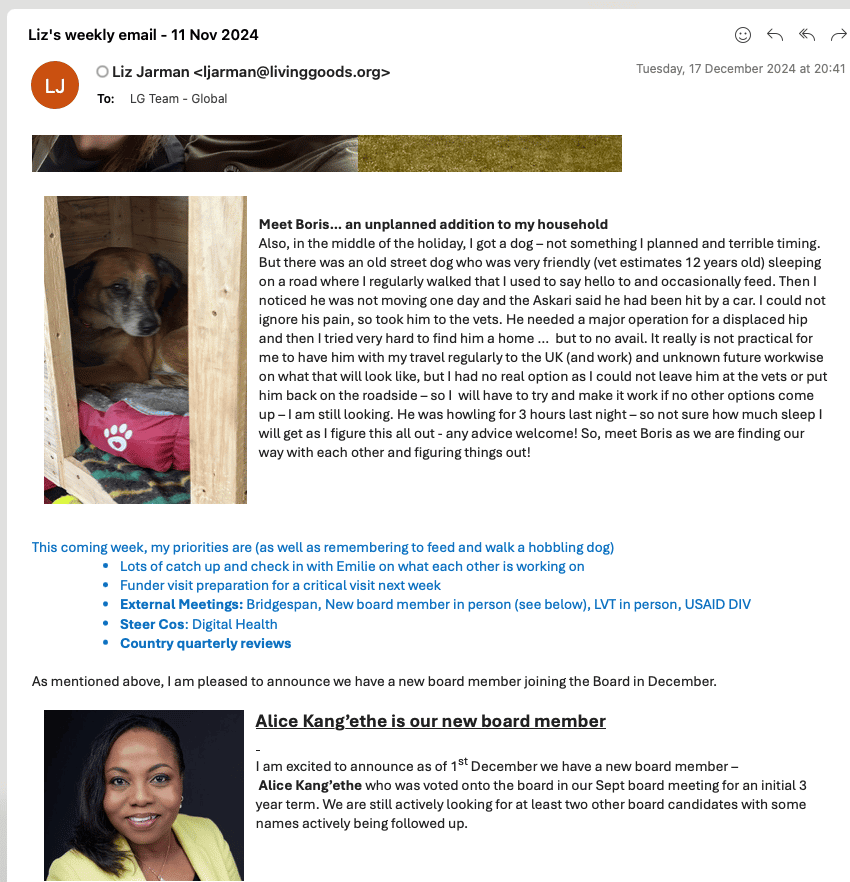 When I was CEO at Living Goods, one of the rituals my team often mentioned was my Monday morning email.